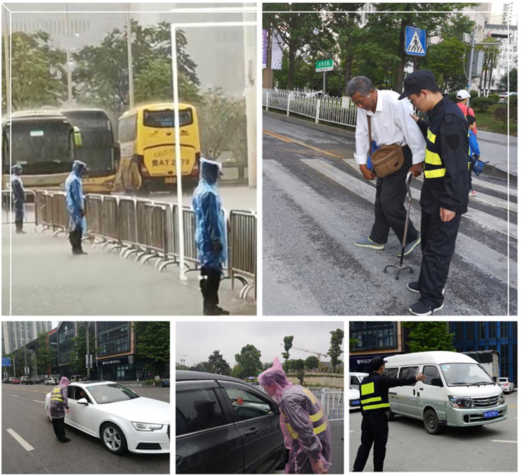 連日來的強(qiáng)降雨,加劇了執(zhí)勤的難度。保安隊(duì)員們頂著狂風(fēng)暴雨,從容不迫地在園區(qū)各條道路和重要路口上維護(hù)秩序、疏導(dǎo)交通、護(hù)送老人、為參觀者指路、引導(dǎo)車輛有序停放,即停即走......盡管雨越下越大,保安員們依舊身著濕透的保安服堅(jiān)守在自己的工作崗位。他們的身影也成為數(shù)博會(huì)現(xiàn)場(chǎng)一道亮麗的風(fēng)景線。