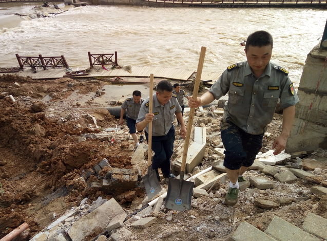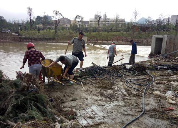 同時(shí),洪水還導(dǎo)致了沿河兩岸絕大部分的沿江步道被淹,綠化、亮化、沿線亭閣、景觀、護(hù)欄均被嚴(yán)重沖毀,河岸邊步道上留下了大量白色垃圾和淤泥。為了使災(zāi)后堆積的垃圾能夠盡快得到清理,小分隊(duì)與環(huán)衛(wèi)工人一起出動(dòng)清淤的同時(shí)還將被洪水沖毀的護(hù)欄邊的垃圾也一同清理干凈。